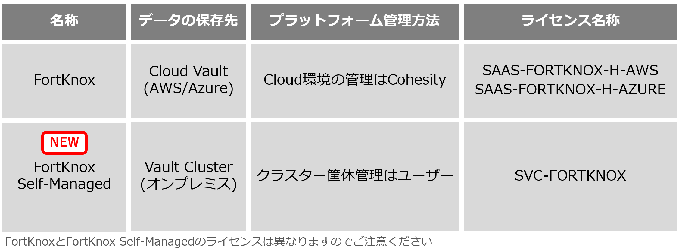 そして今回のバージョン7.3からはFortKnox Self-Managedが登場しました。こちらは、FortKnoxとは別のFortKnox Self-Managedライセンスにてご利用いただけます。ご購入の際は表のライセンス名称でSB C&Sまでお問い合わせください。