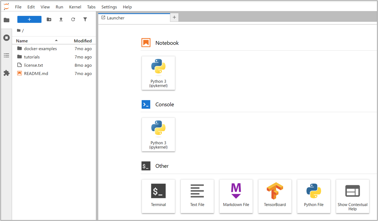 実行後、ブラウザからコンテナのポート番号(9000)にアクセスをし、JupyterLabの画面が表示されることを確認します。