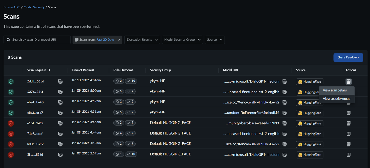 Prisma AIRS > Model Security > Scans にてスキャン結果を確認できます。対象のスキャン項目で [View scan details] を選択します。