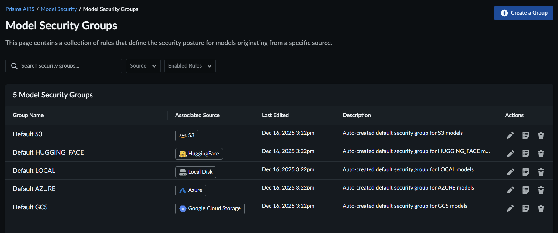 新たにSecurity Groupを作成する際は Prisma AIRS > Model Security > Model Security Groups > Create a Group を選択します。