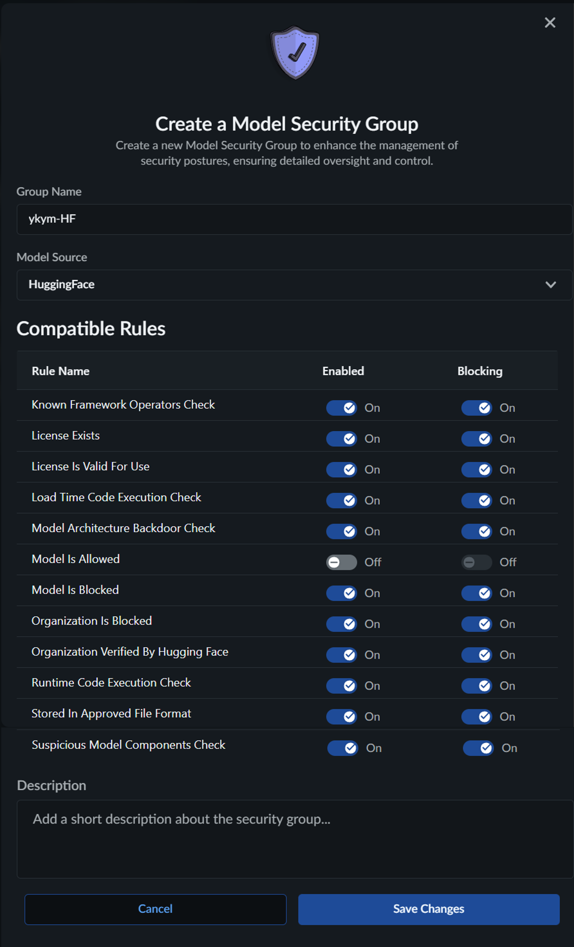 AI Model Securityでは、こうした"モデルそのもの"を 利用前に検査し、危険なモデルが開発環境や本番へ入り込むのを防ぐための機能です。モデル取得〜登録の段階にセキュリティゲートを置けるのが特徴です。