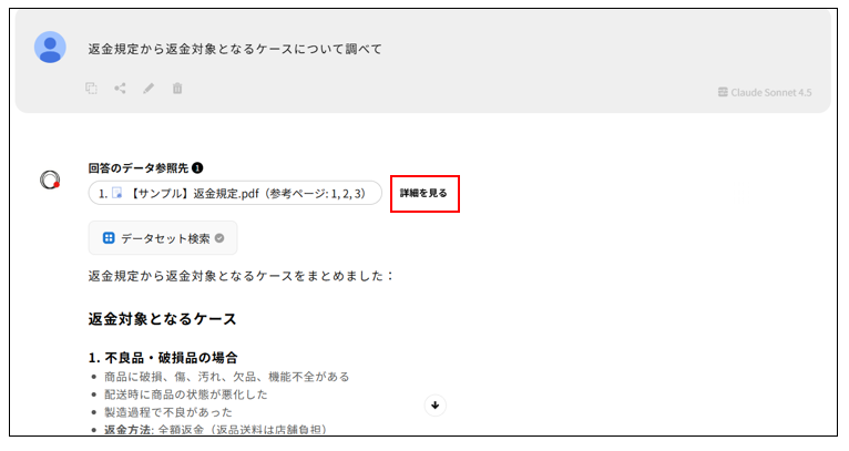 回答時に参照したExcel・PDFファイルのページを別タブでプレビュー表示できます。