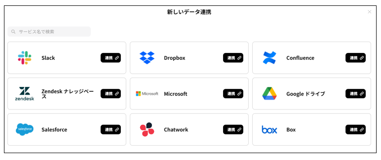 GoogleDrive、OneDrive、Salesforce、SharePoint、Slack、Zendesk