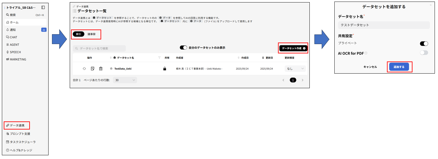2. 「索引」または「議事録」を選択し、「データセット作成」をクリック