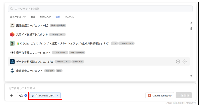 入力欄の「@エージェント」ボタンをクリックすると、会話の途中で特定のエージェントを呼び出せます。