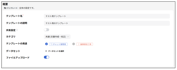 | ファイルアップロード | テンプレート利用時にファイルをアップロードするか設定 |