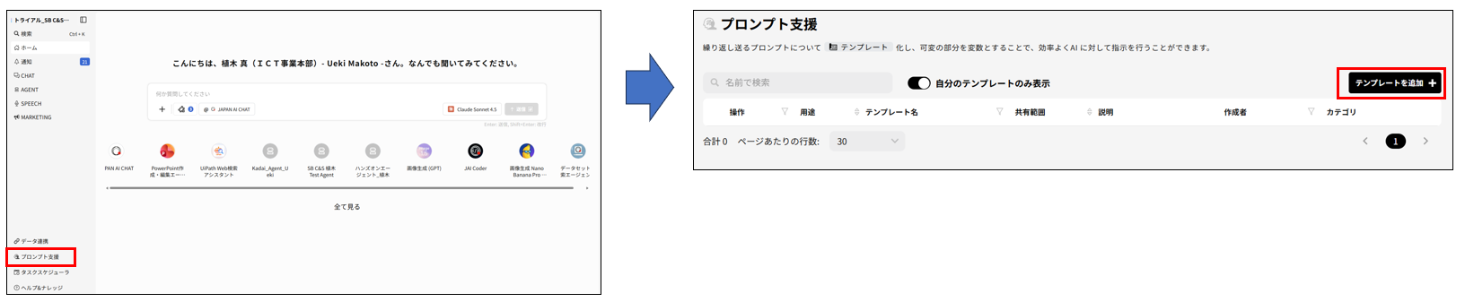 1. 「プロンプト支援」>「テンプレートを追加」を選択