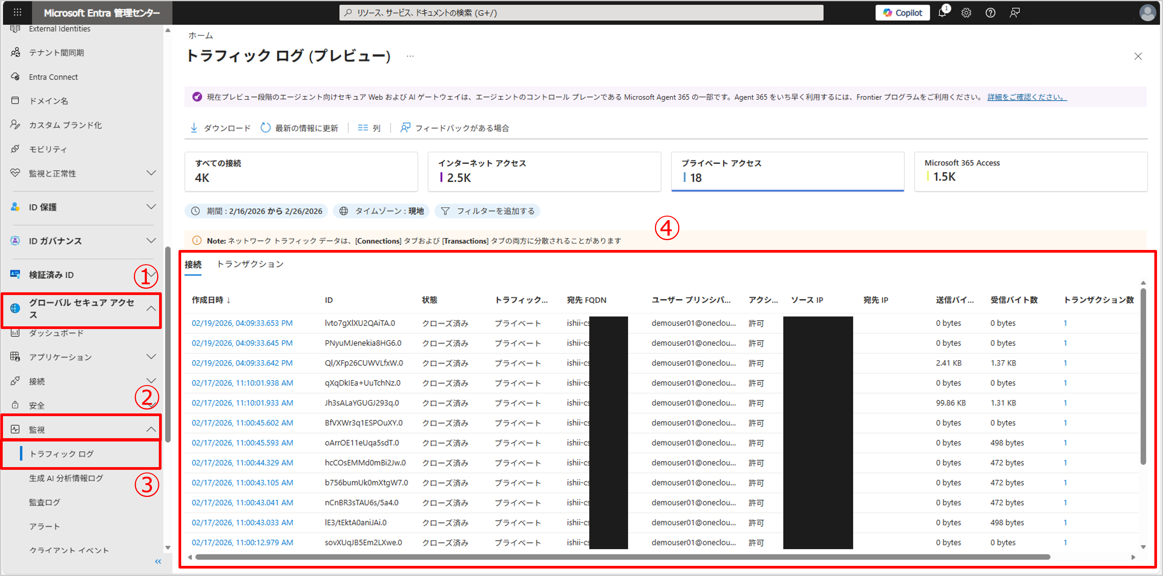 Microsoft Entra 管理センターからもログを確認します。[グローバル セキュア アクセス]-[監視]-[トラフィック ログ]の順に移動します。エンタープライズ アプリケーションへの通信が許可されていることが確認できます。
