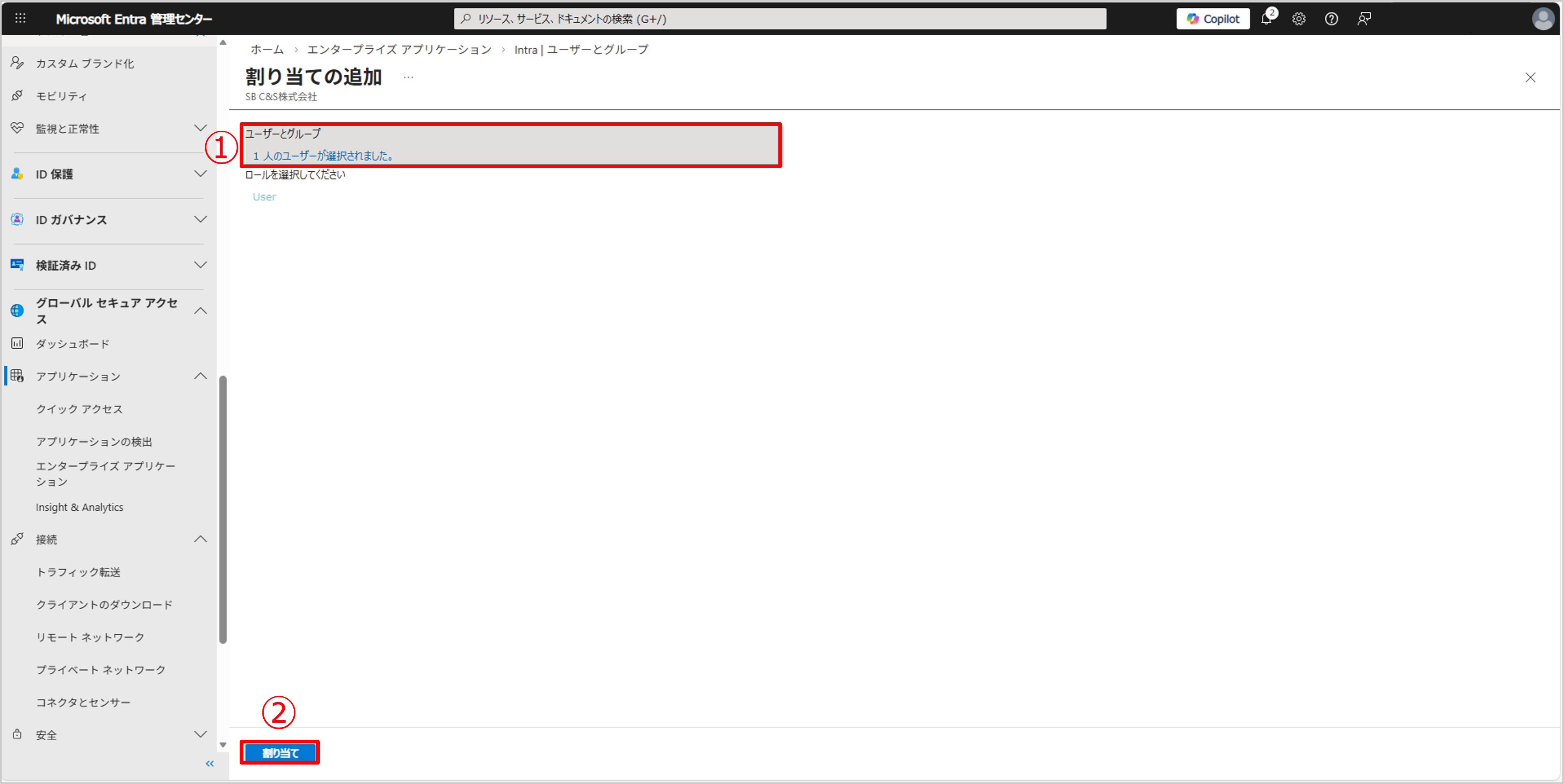 [ユーザーとグループ]下の青字をクリックし、対象のユーザーやグループを追加します。[割り当て]をクリックします。