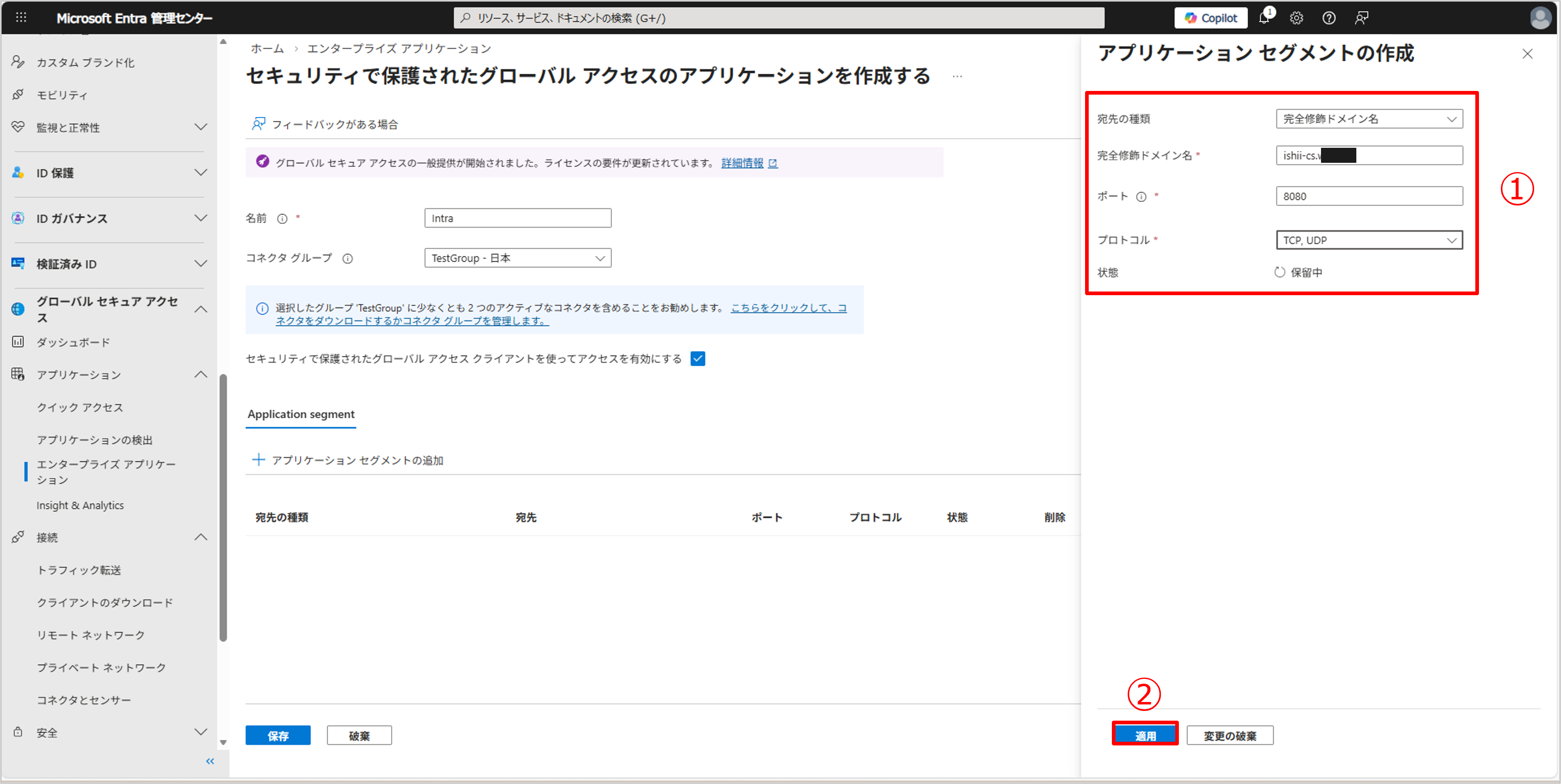 グローバル セキュア アクセスを経由して利用するアプリケーションを登録します。 - Private Accessプロファイルの構成