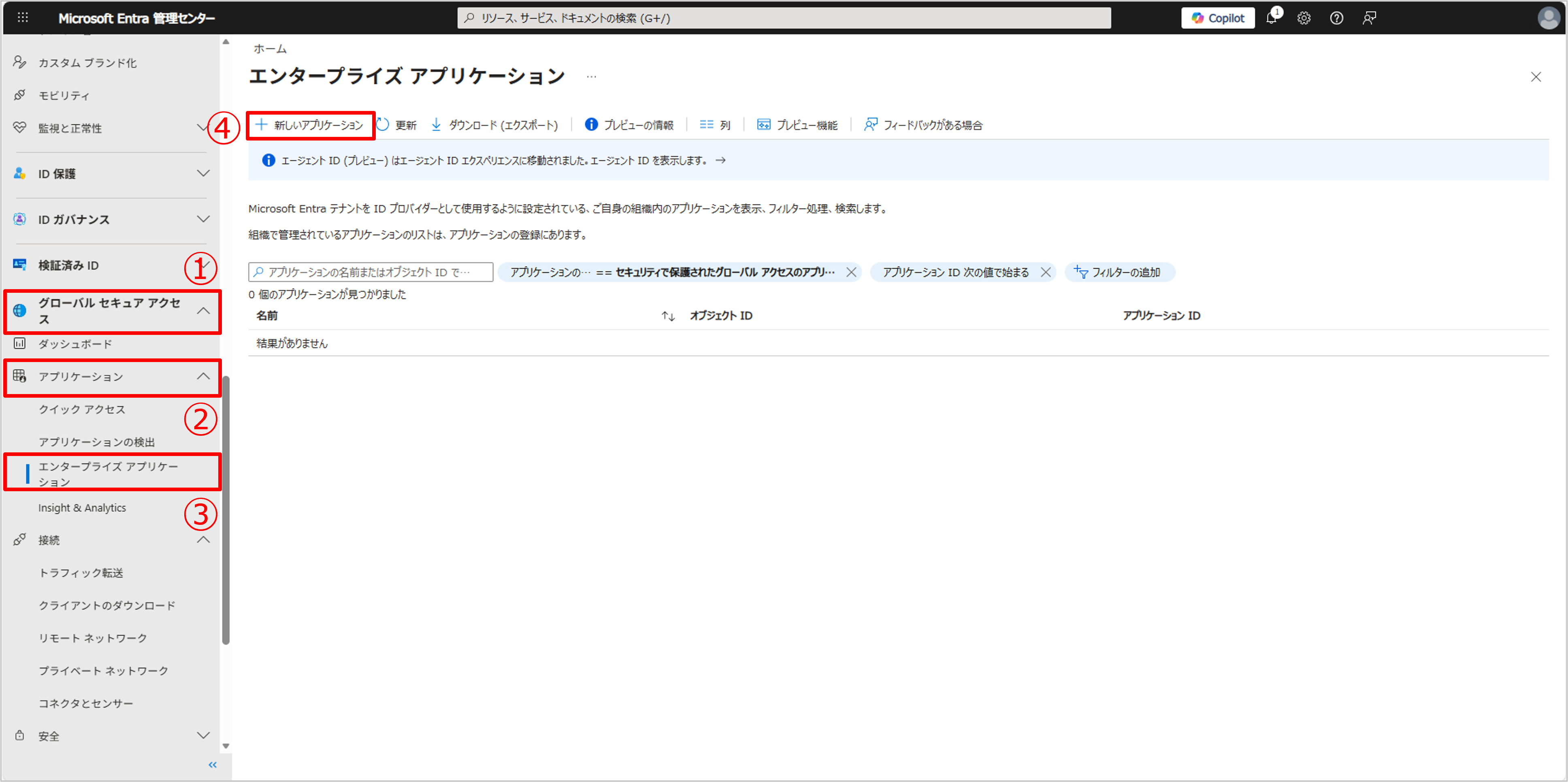 [グローバル セキュア アクセス]-[アプリケーション]-[エンタープライズ アプリケーション]の順に移動します。[新しいアプリケーション]をクリックします。