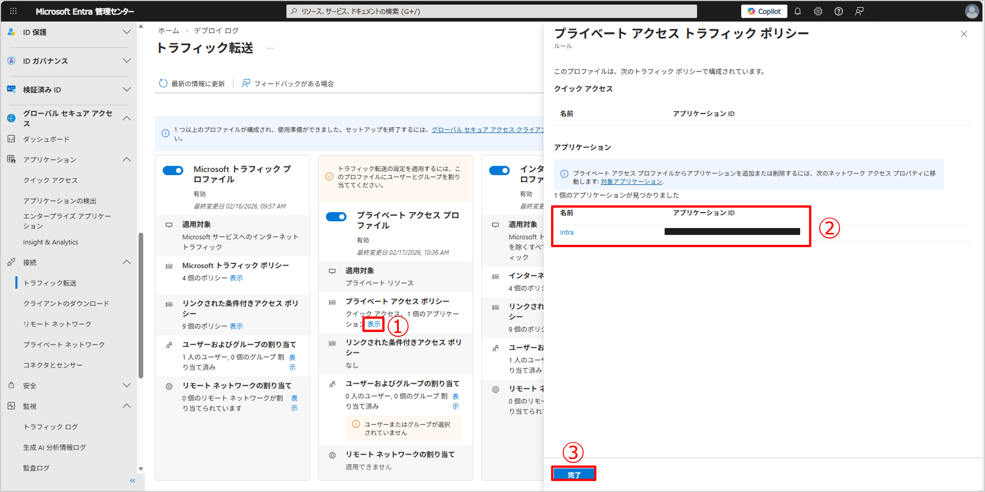 プライベート アクセス ポリシー下の[表示]をクリックします。先ほど作成したエンタープライズ アプリケーションが追加されていることを確認し、[完了]をクリックします。