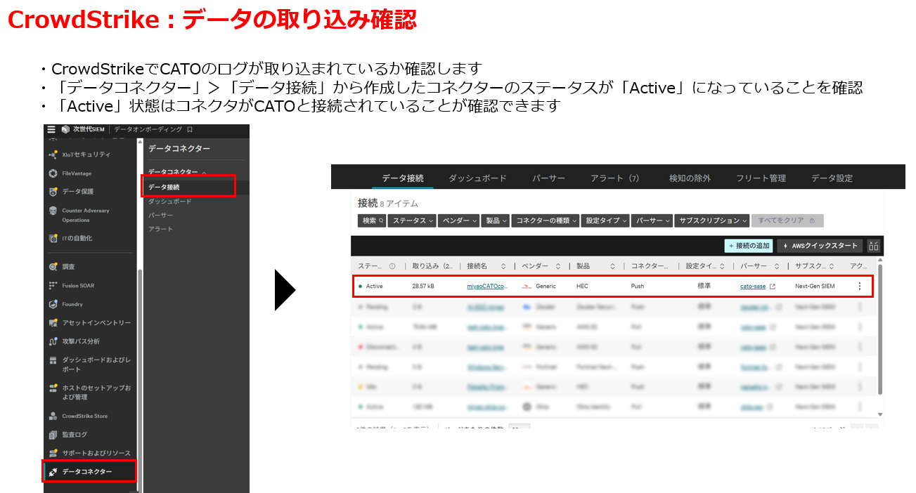 Falconコンソールから「データコネクター」>「データ接続」のページに移動し、作成したコネクターが「Active」になっているか確認してください。