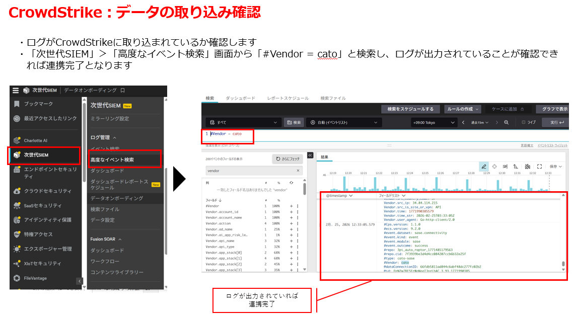 最後に「次世代SIEM」>「高度なイベント検索」画面から「#Vendor = cato」と検索し、ログが出力されているかご確認ください。