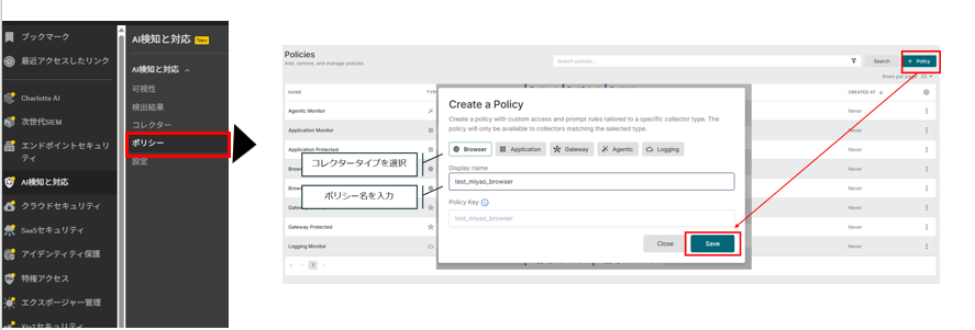 ポリシー作成欄ではポリシー名と対象のコレクタータイプを選択します。前回に引き続き、ブラウザコレクターを選択しポリシーを作成します。