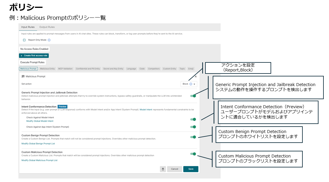 また、ルールはすでにプロンプトインジェクションルールやマスキングルールなどデフォルトでテンプレートが用意されています。今回は、入力ルール(Input Rules)に「Malicious Prompt」というプロンプトインジェクションに関するテンプレートルールを有効化し、ブロック設定を行います。