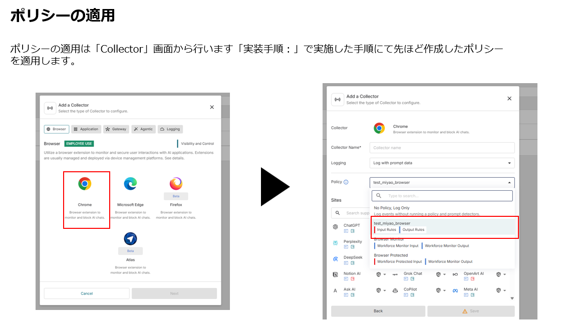 お客様環境に導入されたコレクターには、コレクタータイプ固有のポリシーを割り当てることができます。コレクタータイプに応じて、ポリシー内で定義されたルールはAIワークフローのさまざまな段階でデータのレポート、ブロック、または変換を行います。