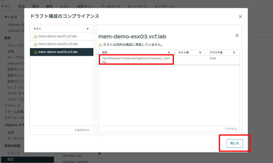 vSphere Configuration Profiles を使用して Memory Tiering の有効化や動作ポリシーを制御します。ここでは、vSphere Configuration Profiles を使用して Memory Tiering を設定する手順を説明します。