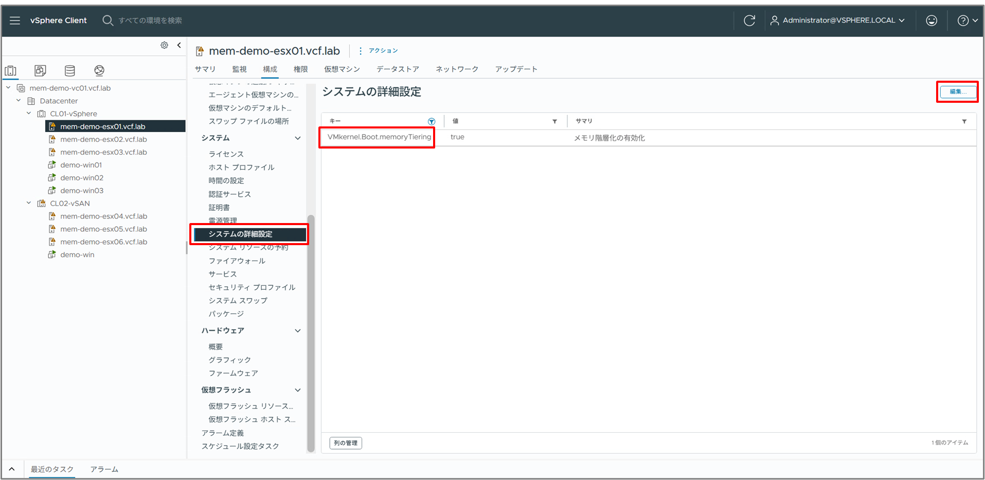 ESX ホストの構成から「システムの詳細設定」を選択し、「VMKernel.Boot.memoryTiering」を確認します。「編集」をクリックします。
