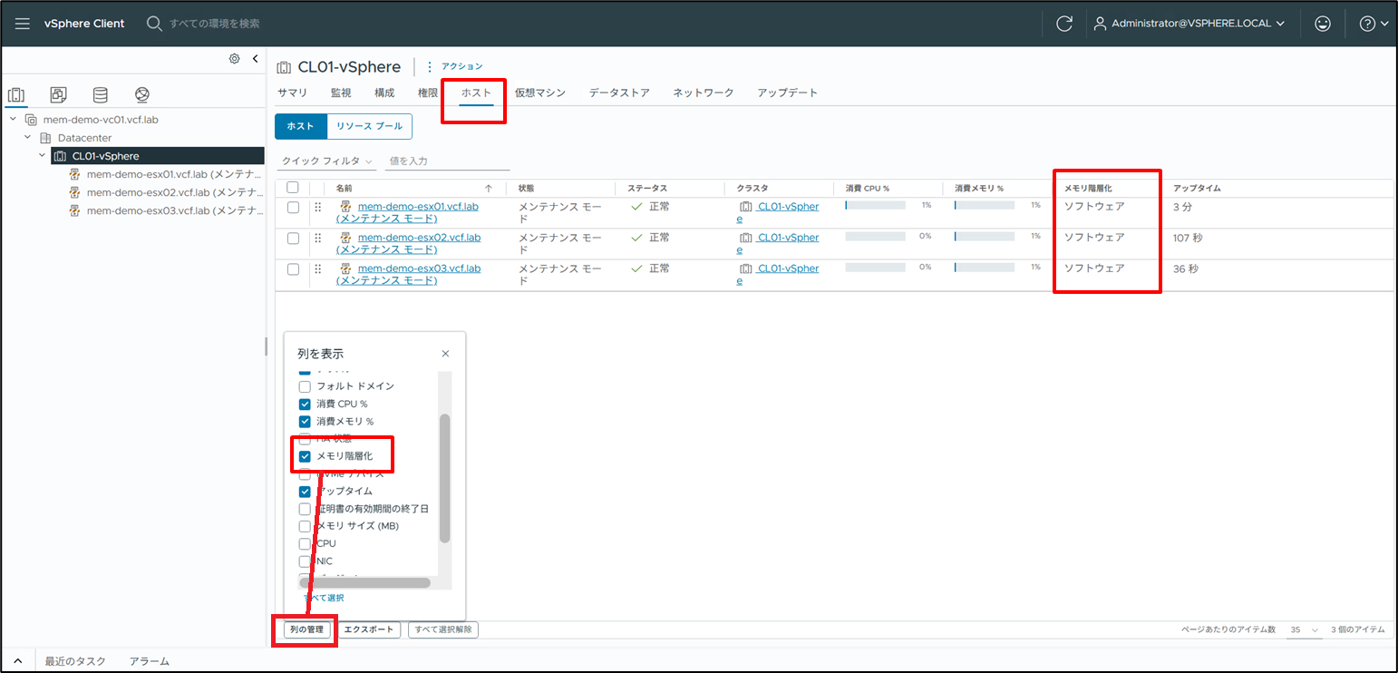 左ペインから対象クラスタを選択し、ホストの一覧を表示します。画面左下の「列の管理」をクリックし、「メモリ階層化」にチェックを入れることで、該当の列が追加され、状態を確認できるようになります。