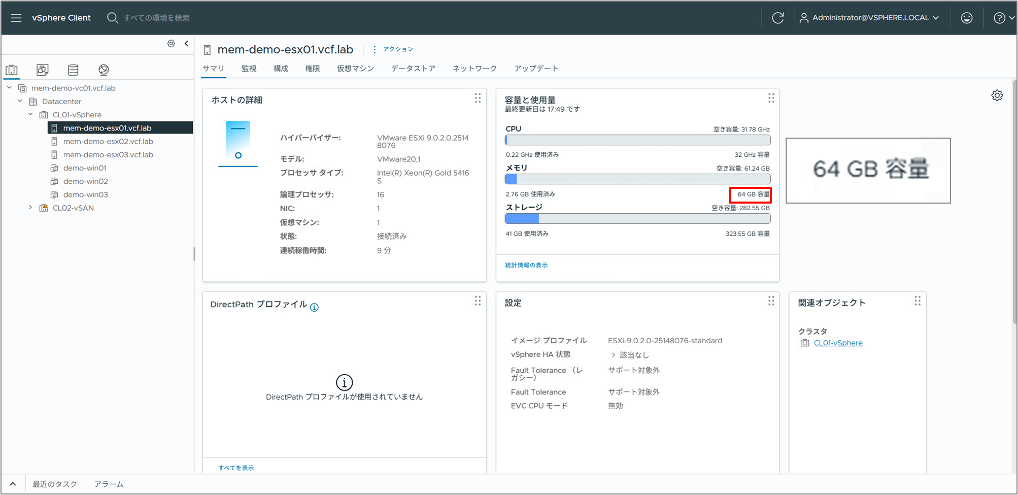 この時点で vSphere Client 上では、ESX ホストのメモリ容量は DRAM として 「64 GB」 と認識されています。