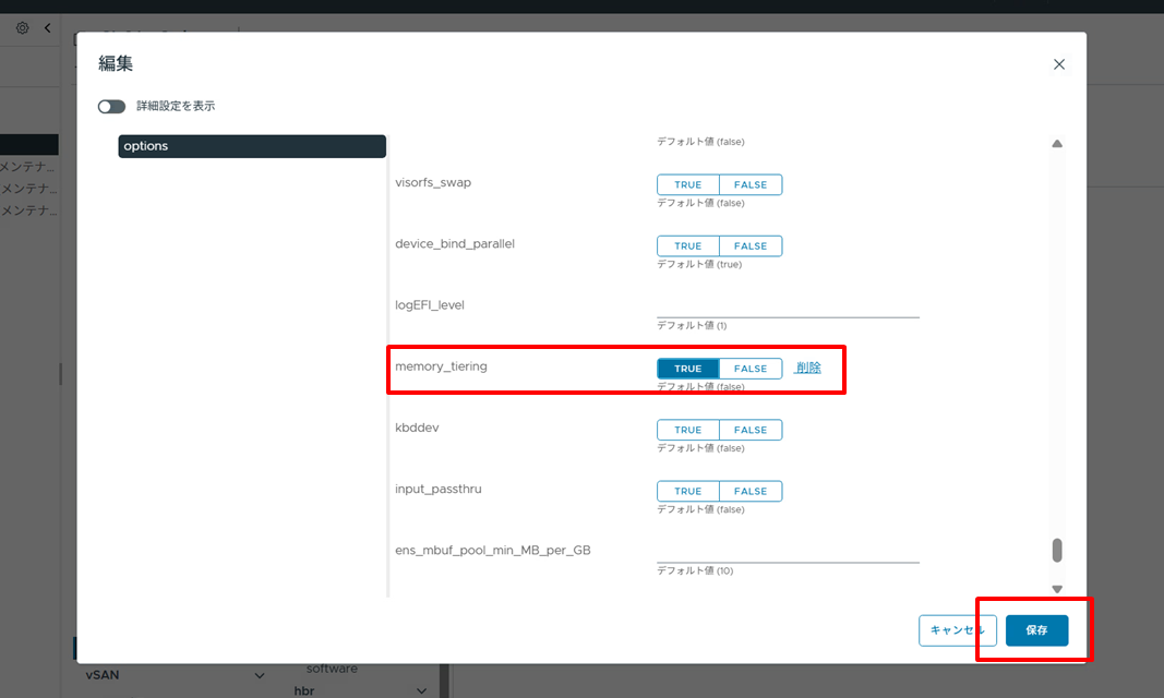 memory_tiering をの項目で「TRUE」をクリックし「保存」します。