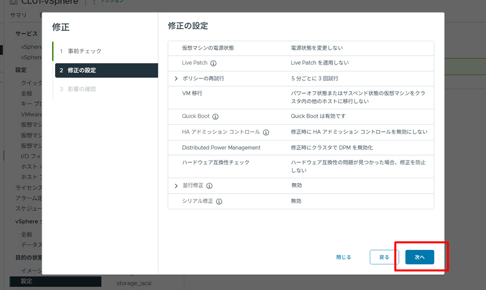 影響を確認して「修正」をクリックします。※ホストの再起動が発生します。