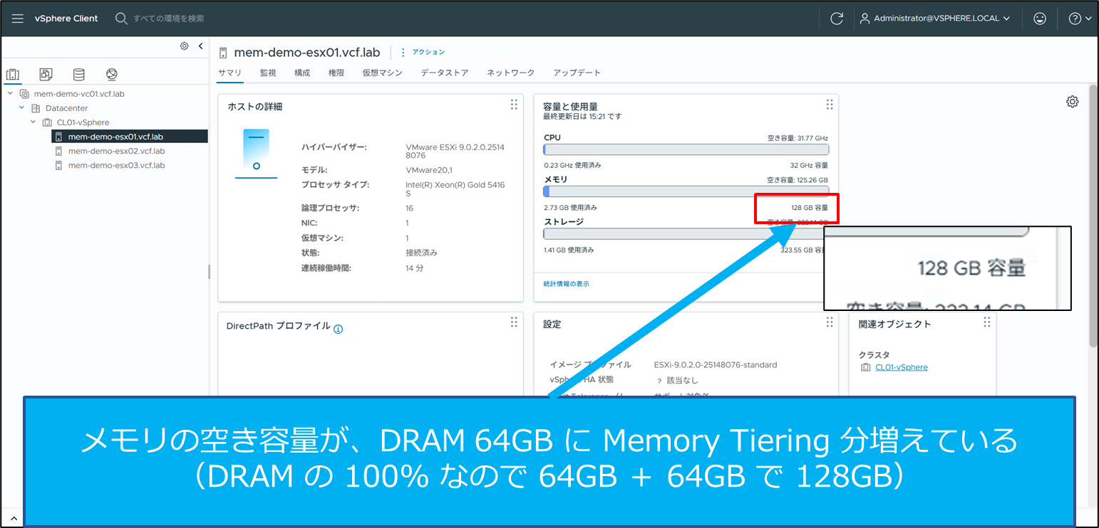 DRAM 64GB に対し、Memory Tiering により同容量の 64GB が追加されています。