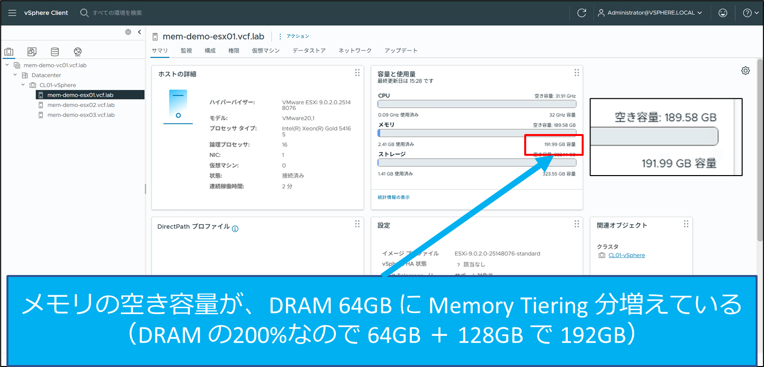 ホストを確認すると、メモリ容量が増えています。メモリの容量は、DRAM 64GBに対してMemory Tiering分が加算され、設定が200%の場合は64GB+128GBとなり、合計192GBとして利用可能となります。