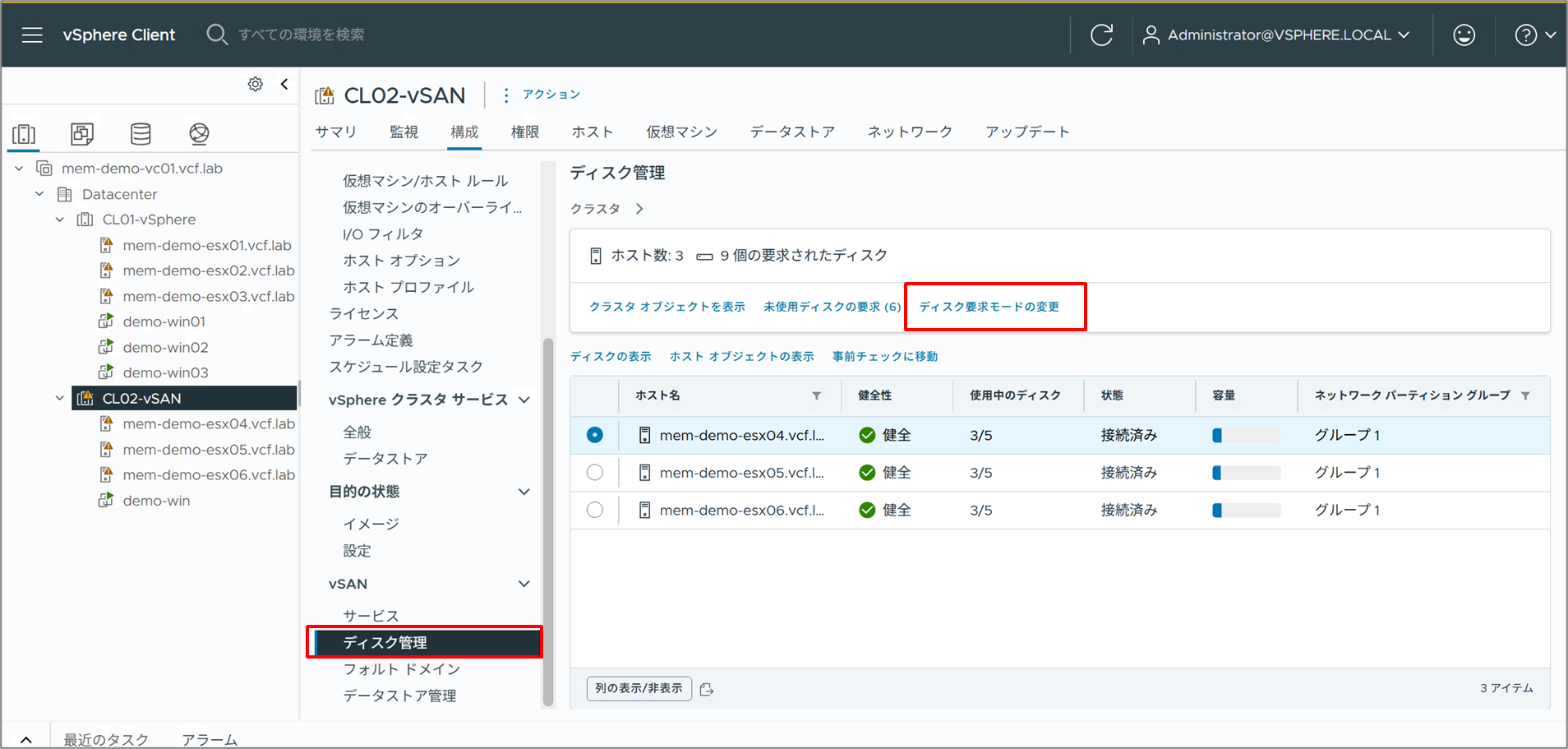 vSAN クラスタの構成から「ディスク管理」を選択し、「ディスク要求モードの変更」をクリックします。