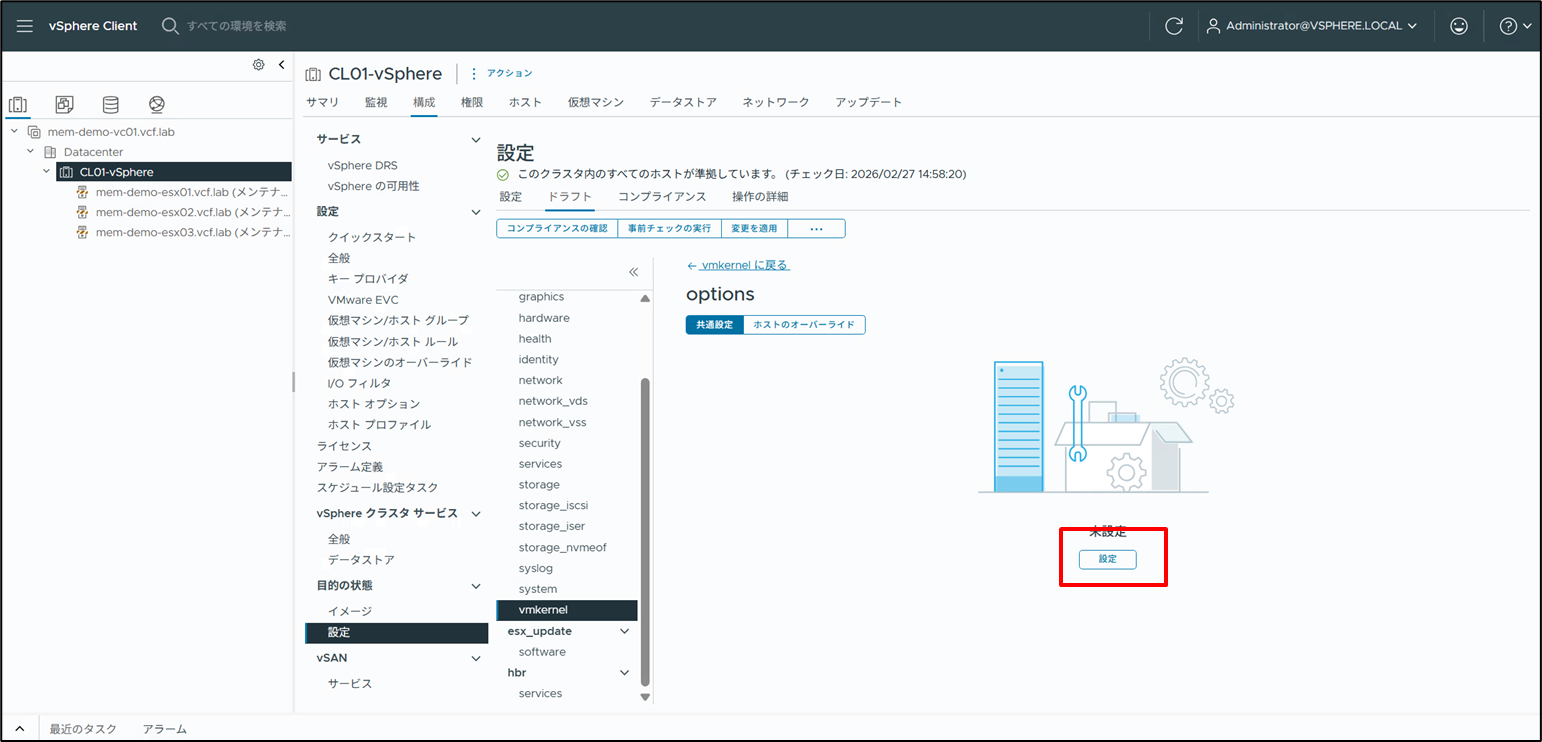 本検証では、クラスタ レベルで Memory Tiering を有効化するため vSphere Configuration Profiles(クラスタレベルでの構成の管理)を有効にします。
