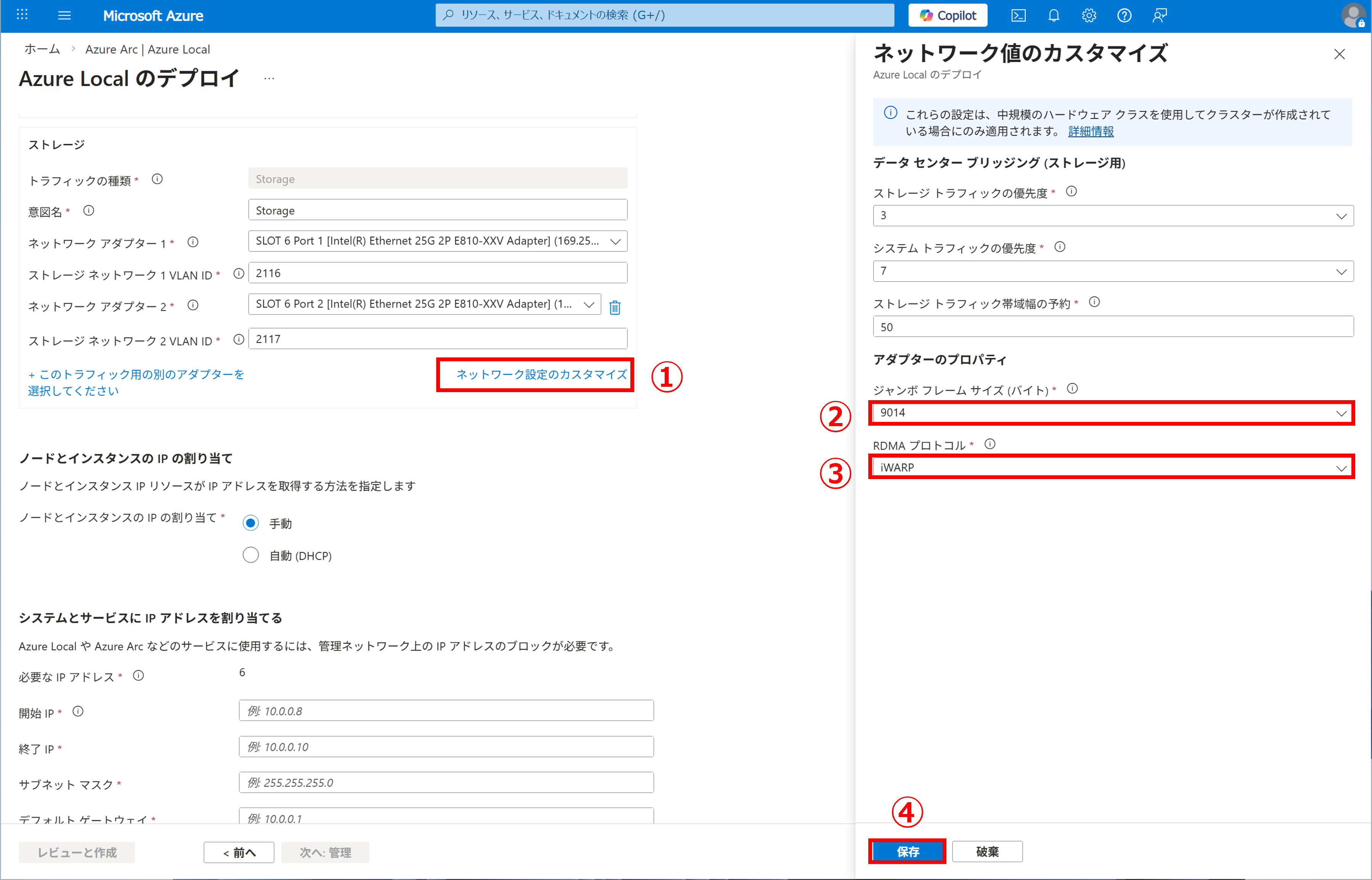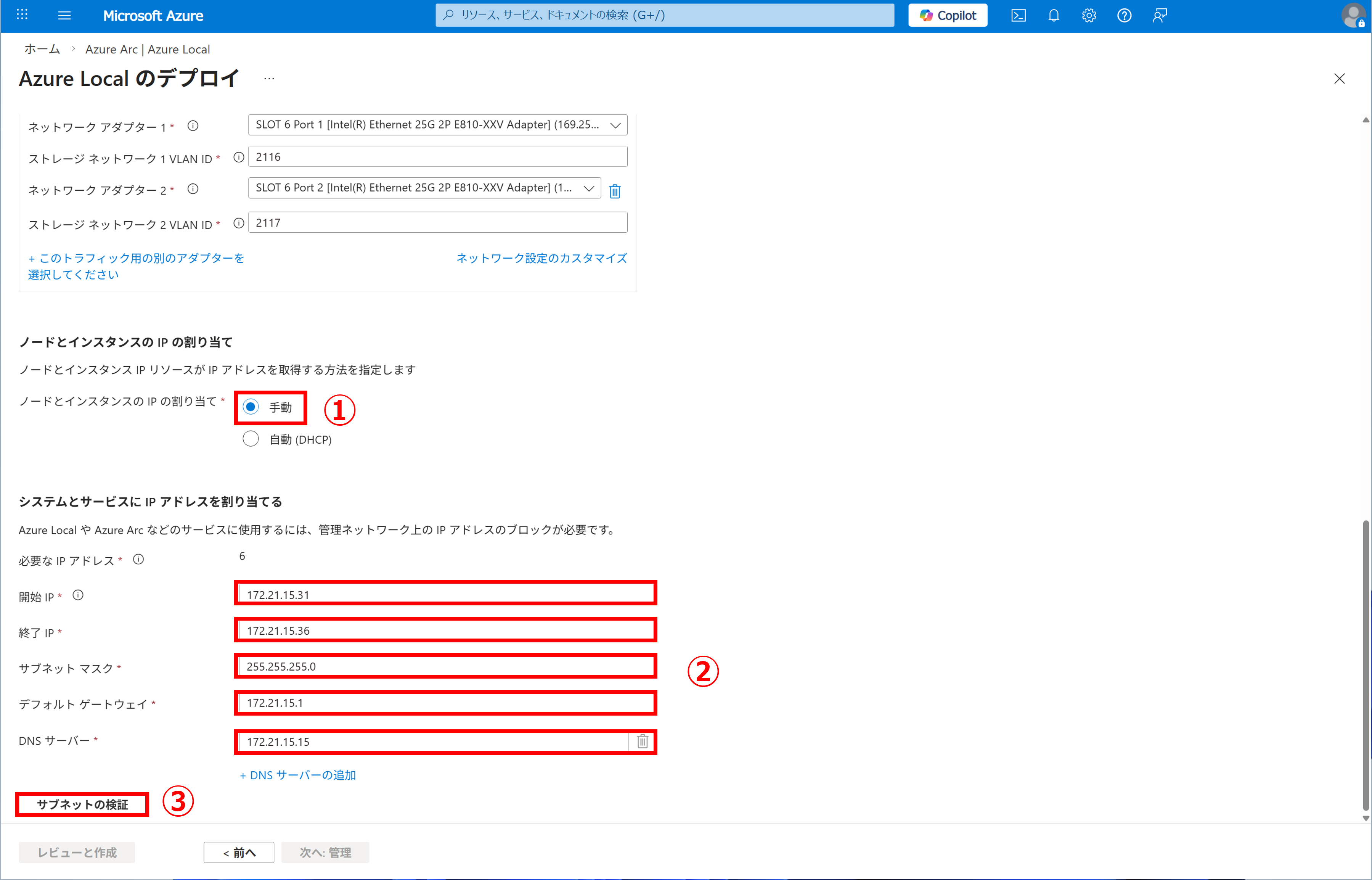※これらのIPアドレスは、クラスターIPやAzure Arc連携するために作成されるインスタンスに割り当てられます。デプロイ後に変更はできないため、ご注意ください。 - 「デフォルトゲートウェイ」、「DNSサーバー」についても事前に用意したものを入力します。