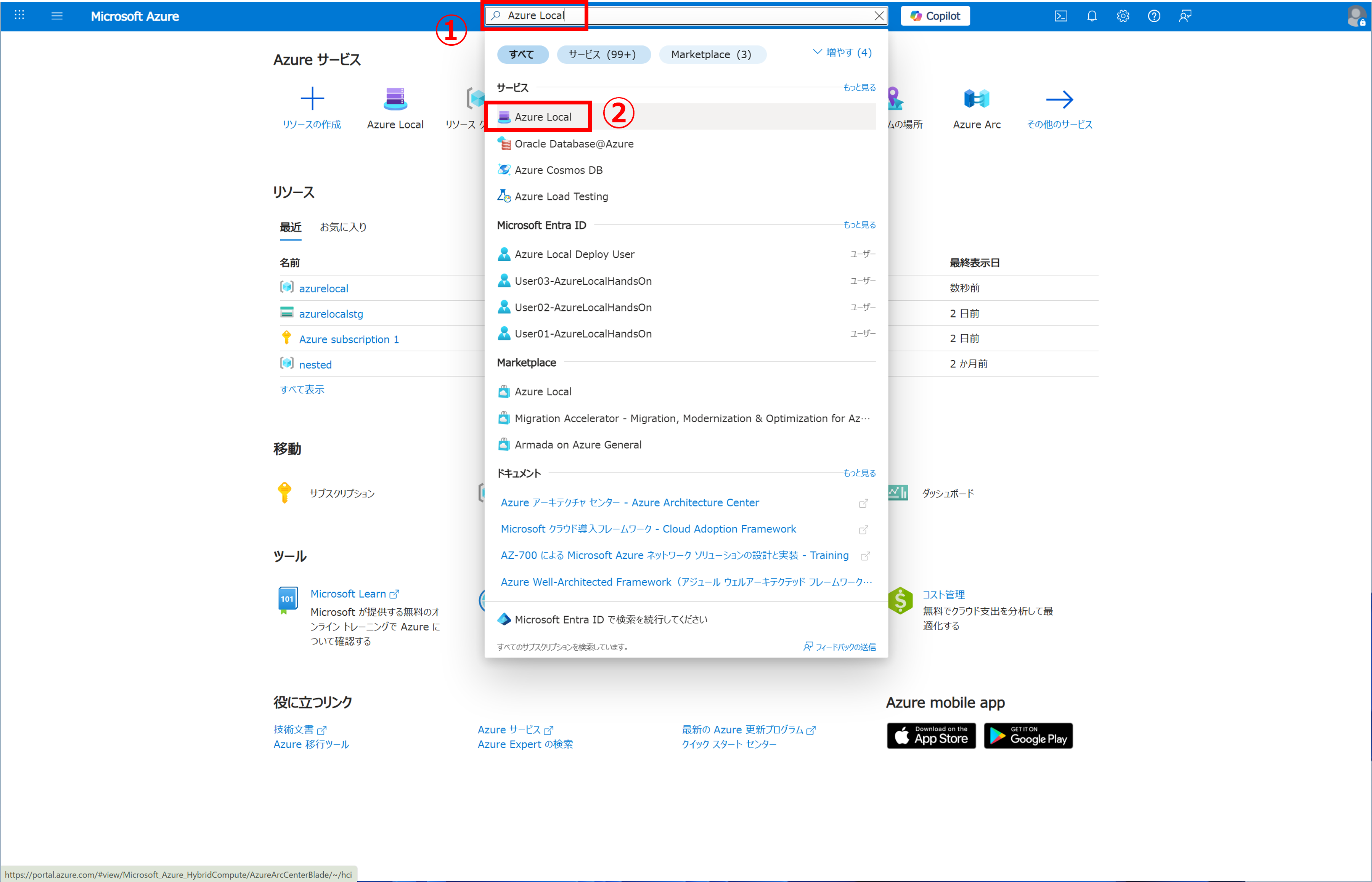 2. 検索窓で [Azure Local] と検索し、Azure Localサービスをクリックします。