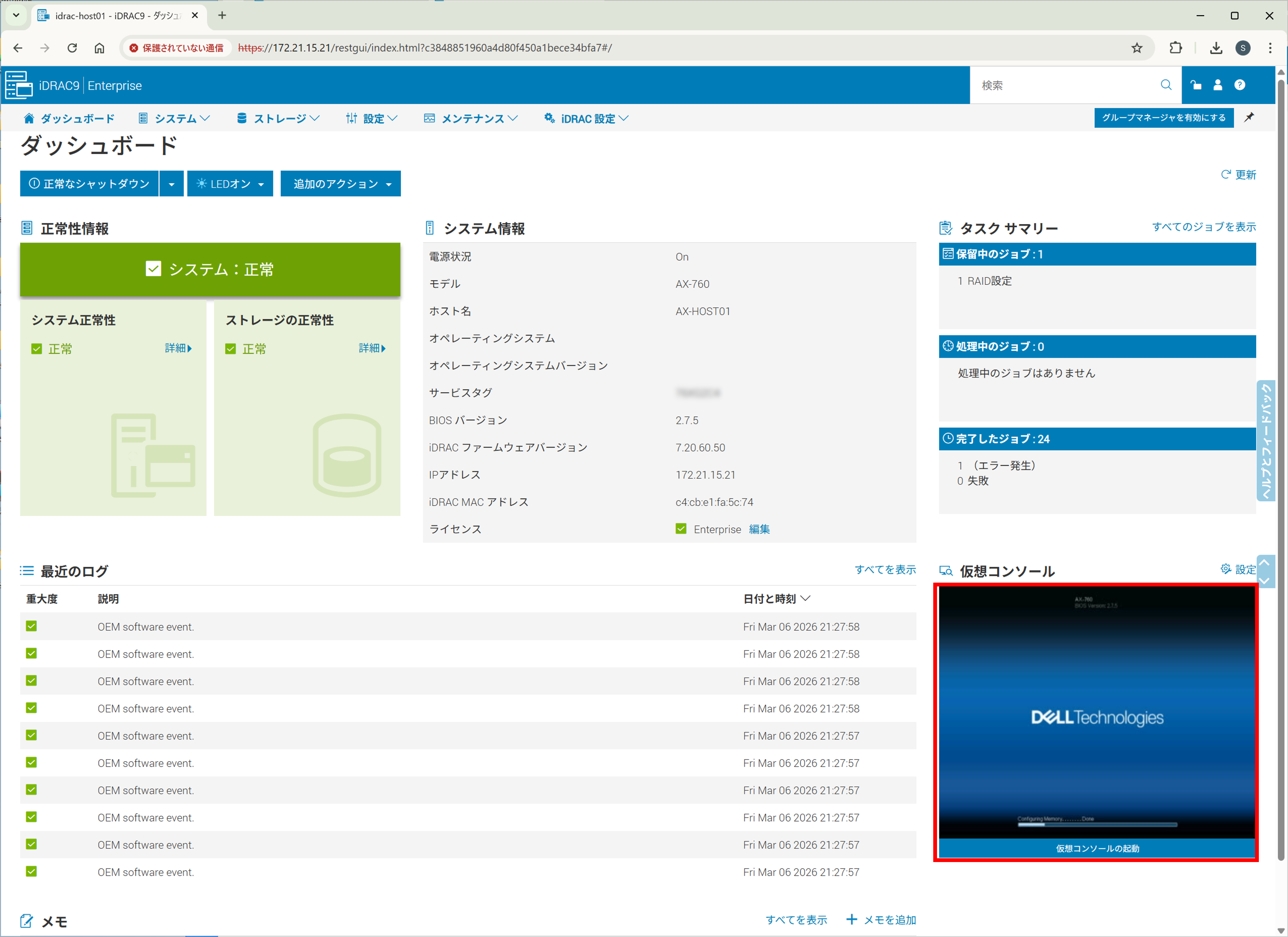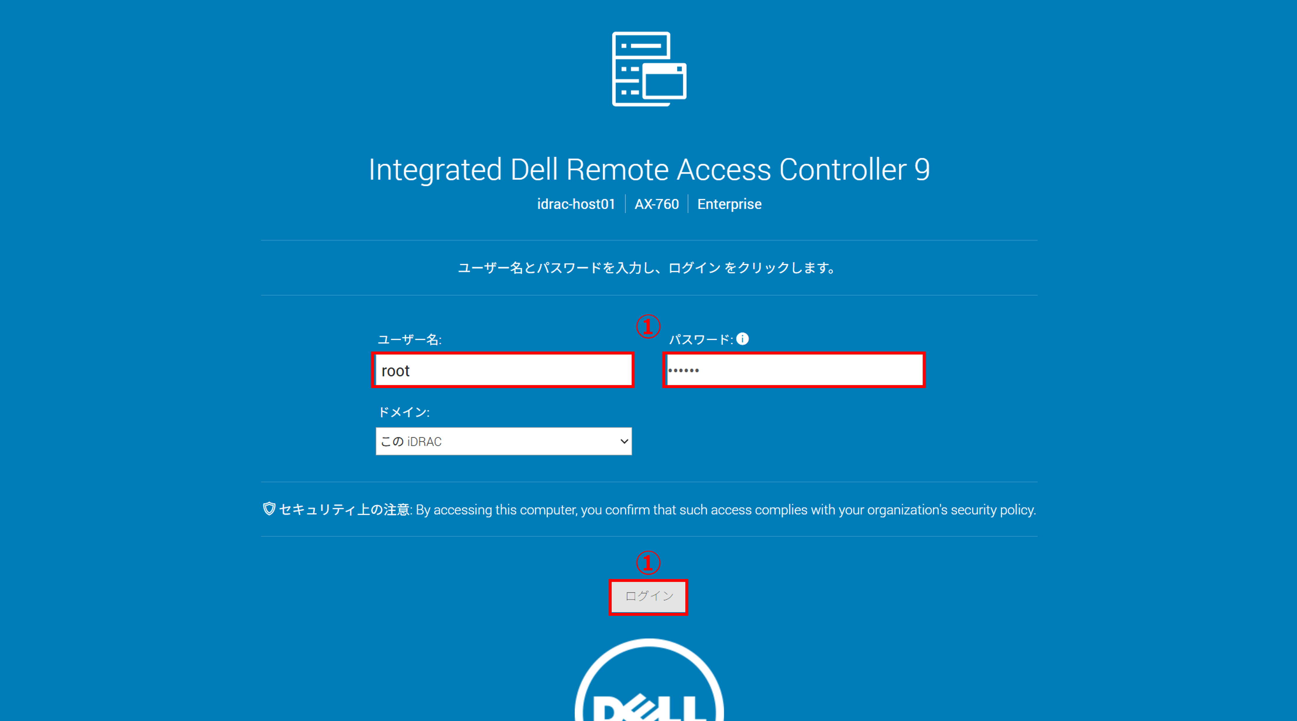 7. ブラウザで [https://<iDRAC IPアドレス>] にアクセスし、iDRACのデフォルトの資格情報 [ユーザー名:root / パスワード:calvin] でログインします。