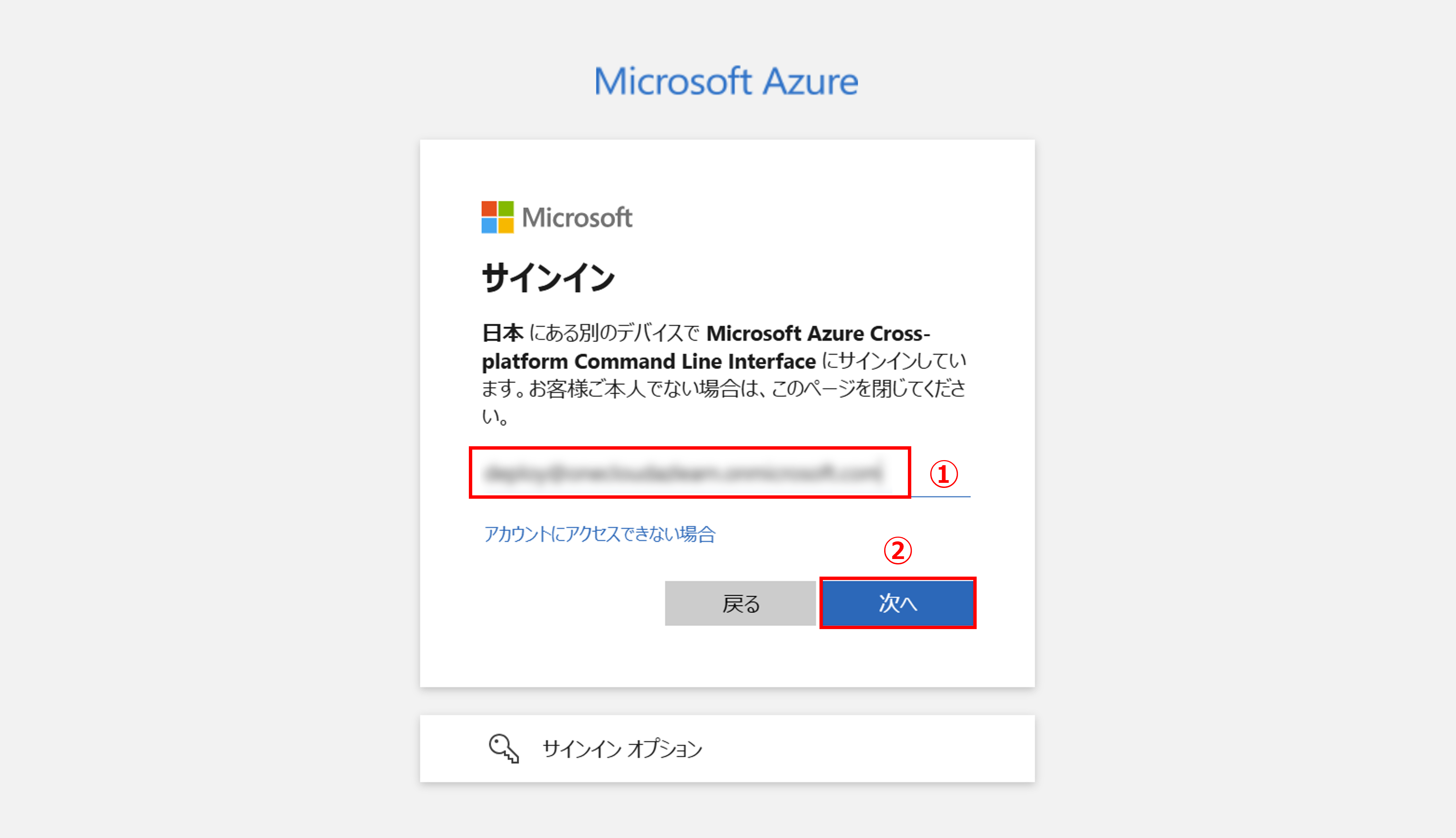 - アカウント情報には、準備編で用意したAzureのデプロイ用ユーザーを入力します。