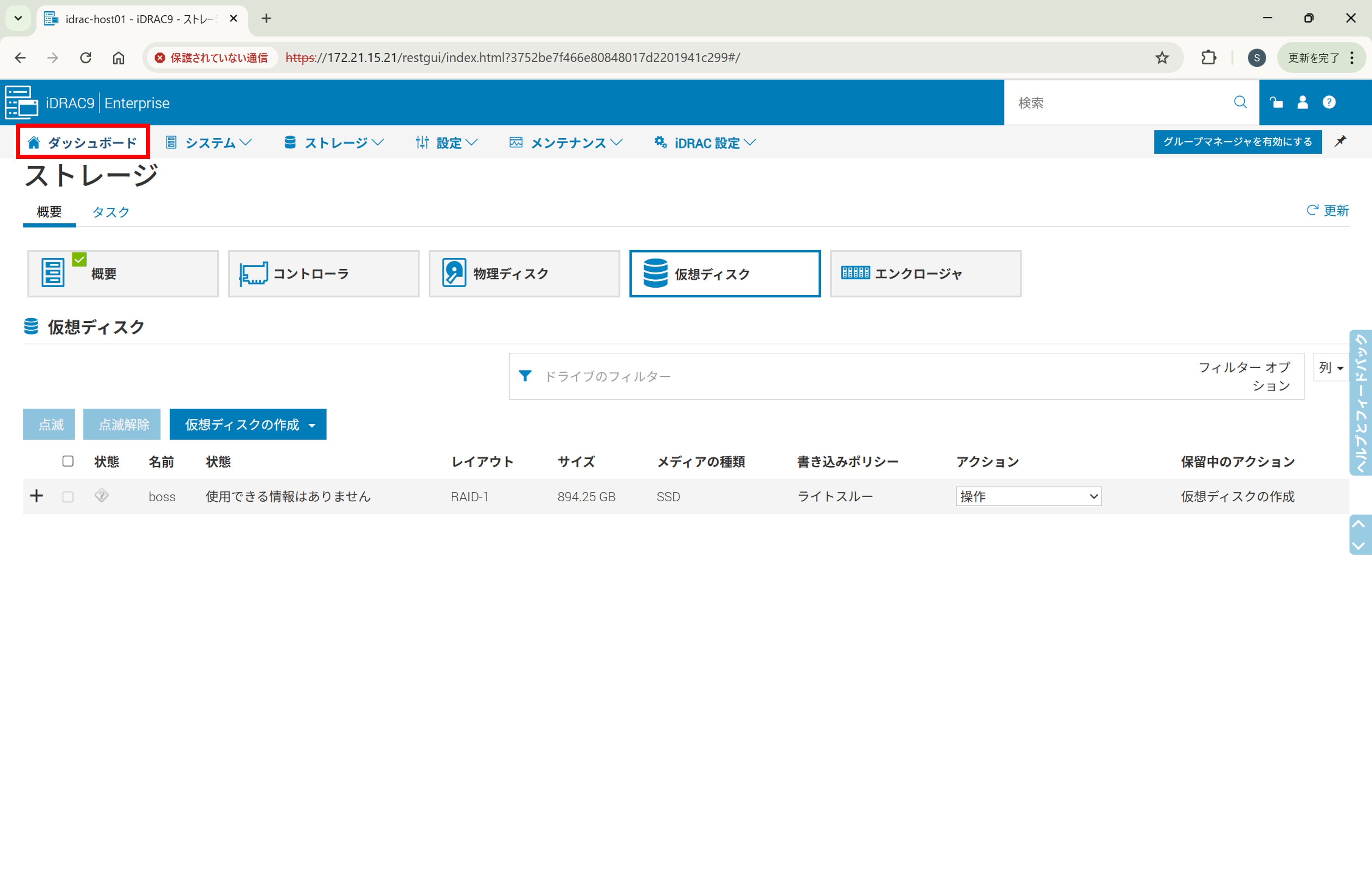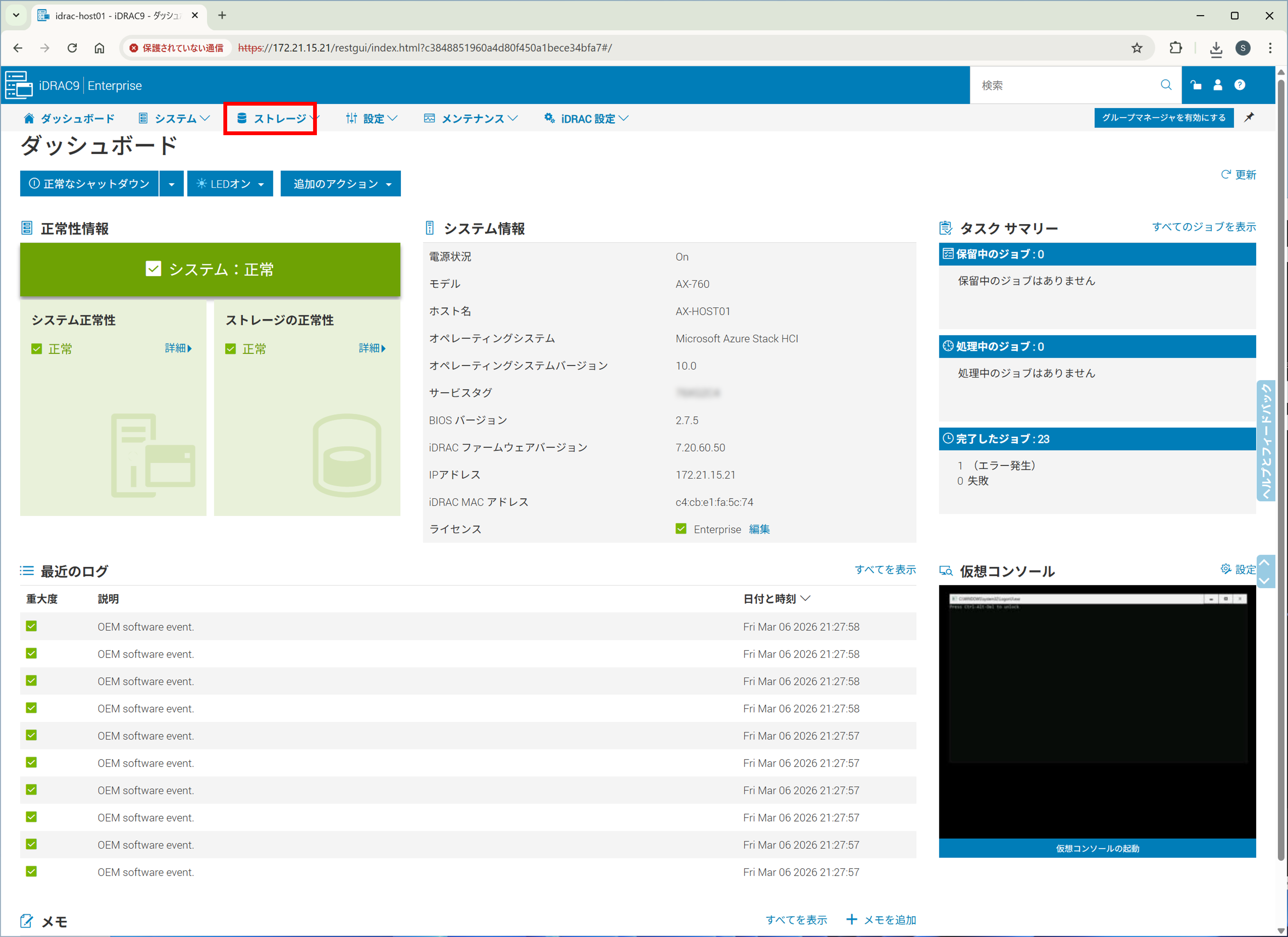 1. iDRACへログインし、ダッシュボード上部にある [ストレージ] タブをクリックします。