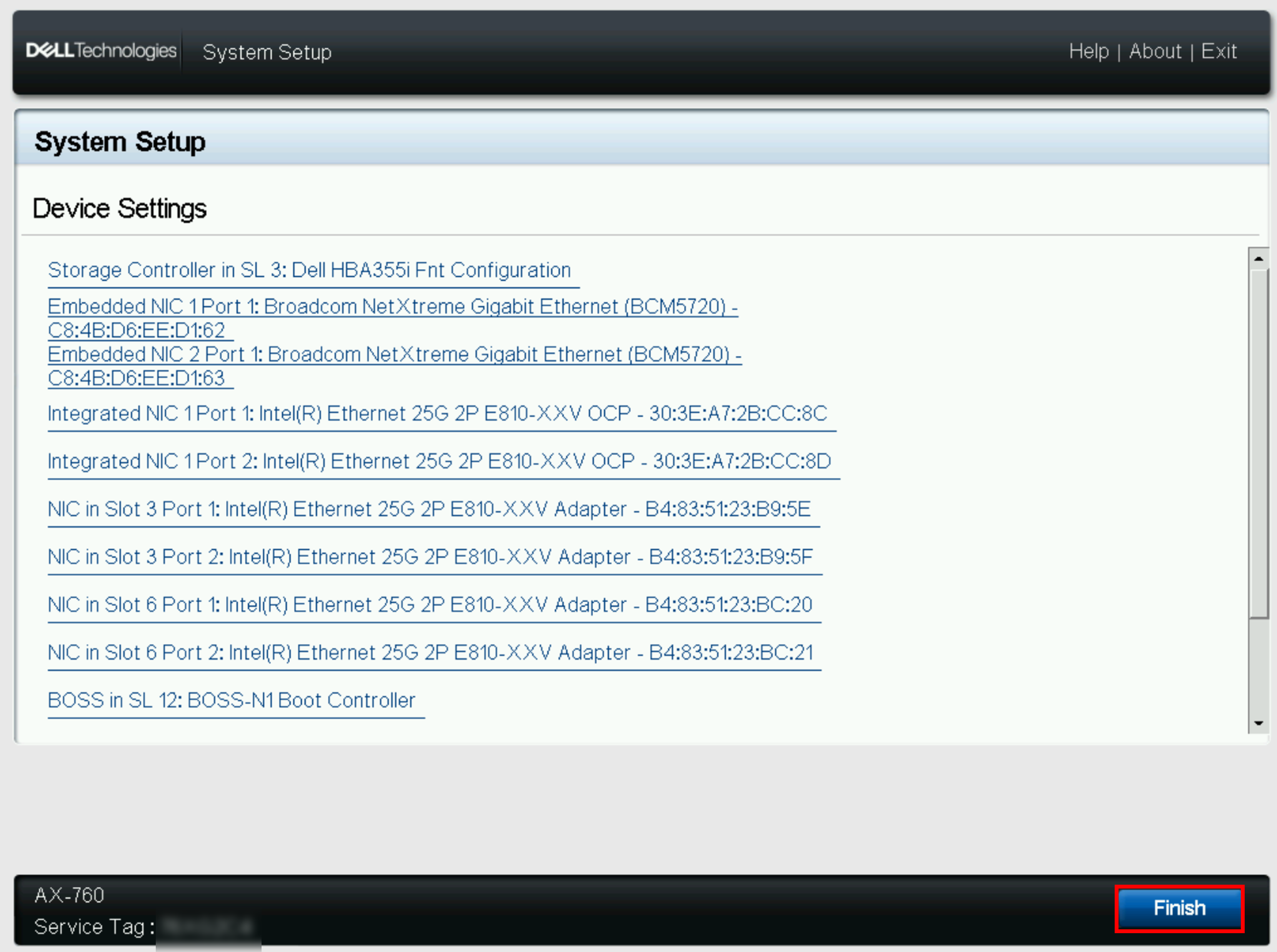 8. [Finish] > [Yes] の順で設定を保存し、System Setupから離脱します。