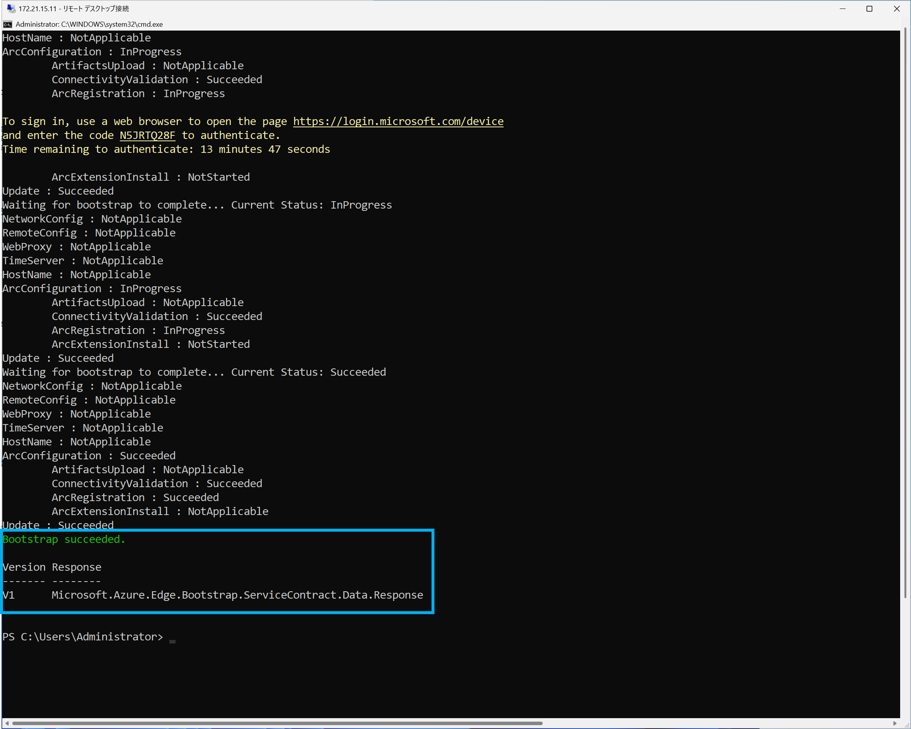 7. PowerShellに戻り、しばらくして「Bootstrap succeeded.」と表示されたらAzure Arc登録の成功です。