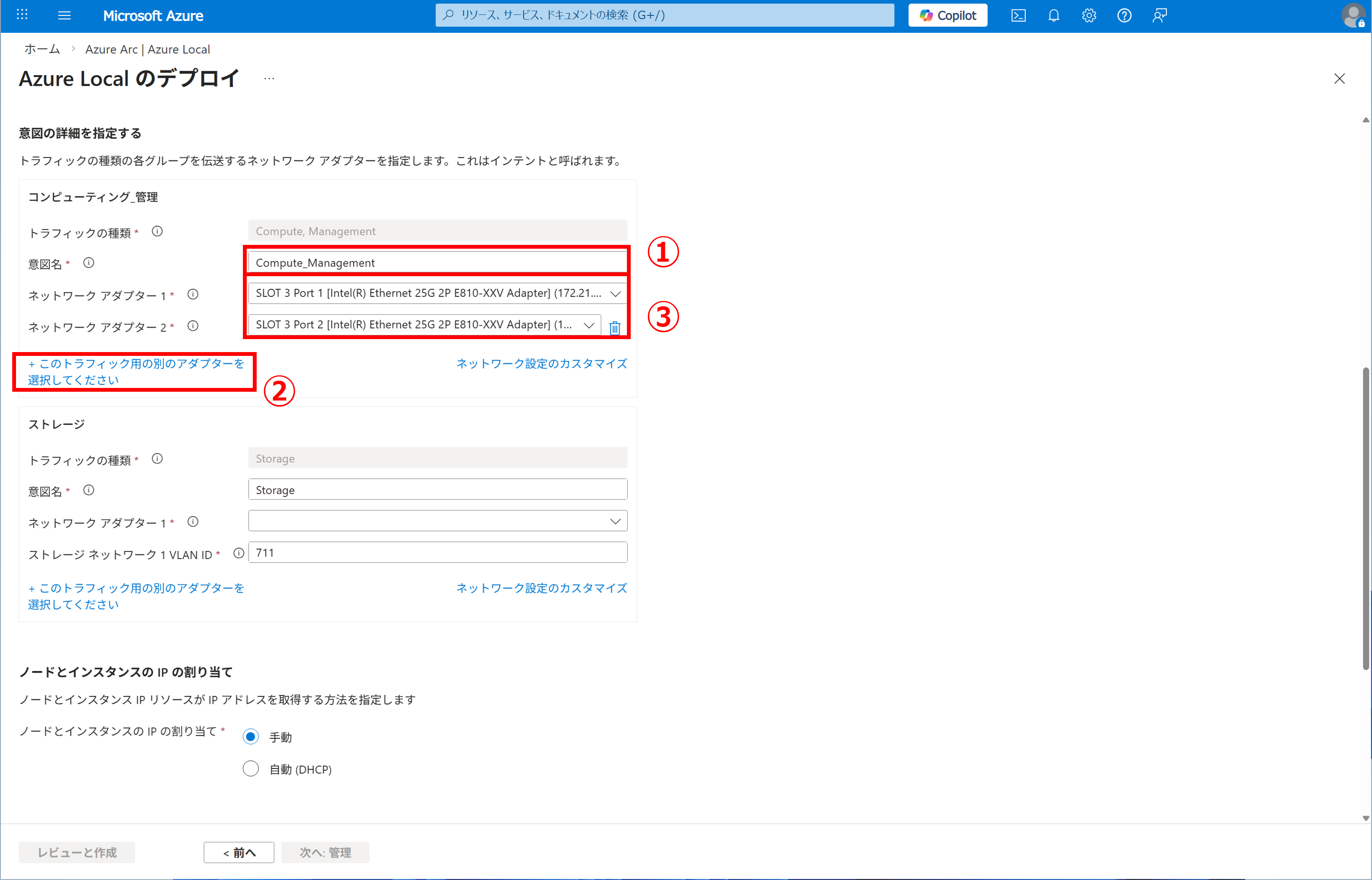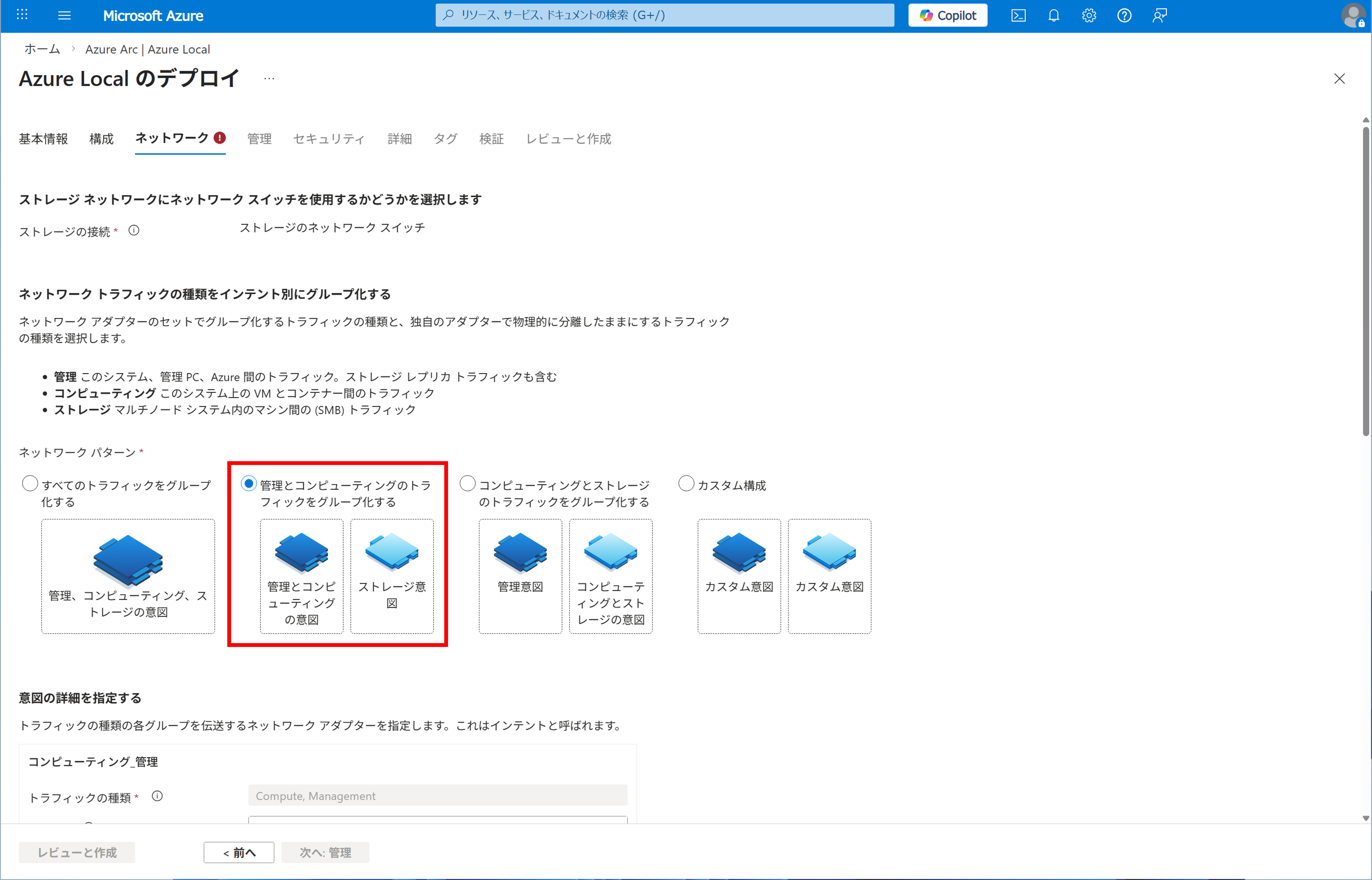 ※Azure Localの場合、ストレージトラフィック用のIPアドレスをこれまでのステップで設定していませんでしたが、ネットワークATCが自動的にIPアドレス(内部的なローカルアドレス)を割り当ててくれます。 - インテント(意図)