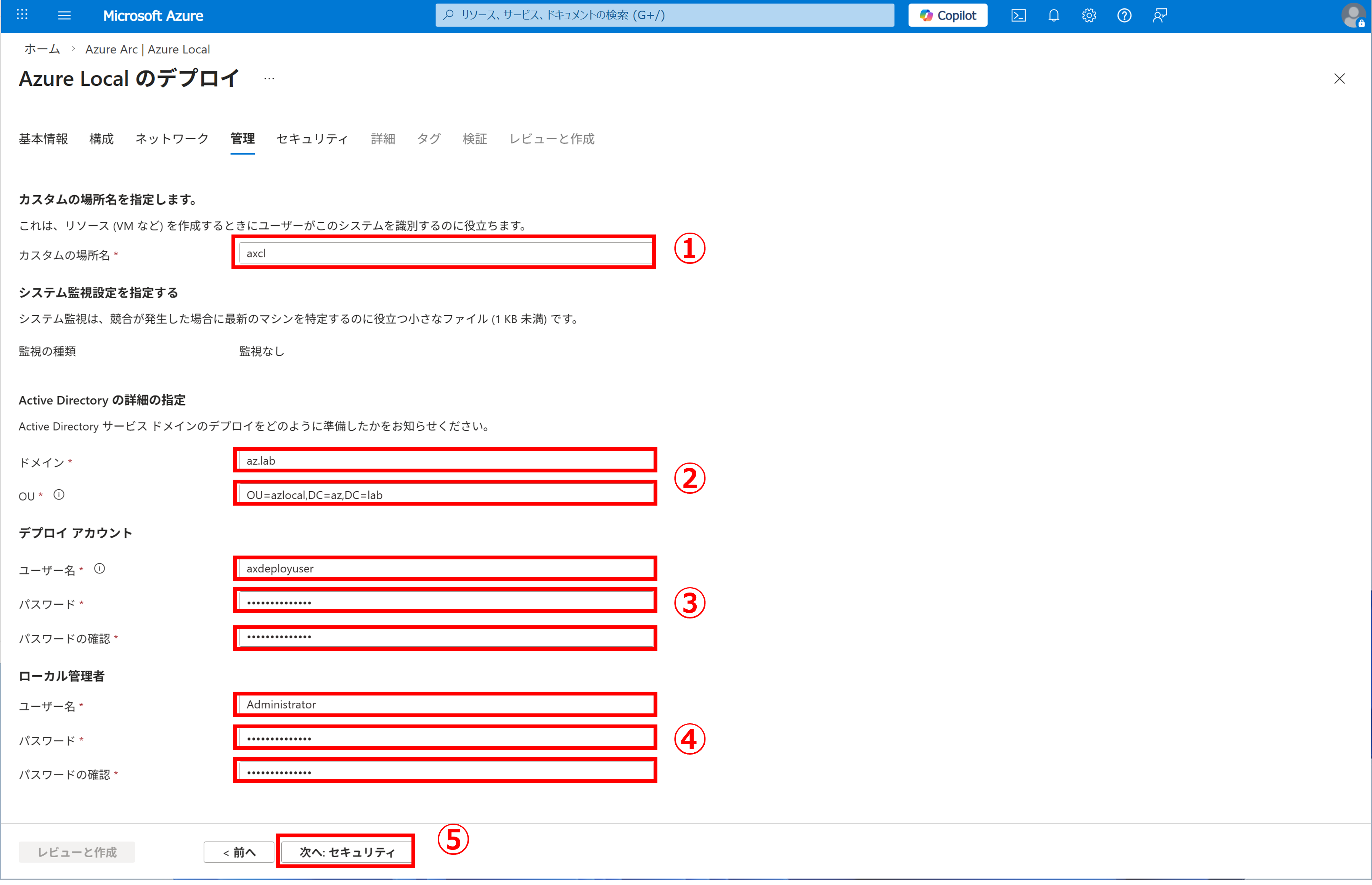 - 「デプロイアカウント」には、事前にADに作成したデプロイユーザーアカウントの認証情報を入力します。