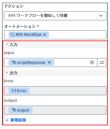 例:サービスタスクで実行するRPAに 入力/出力 の引数がある場合、下図のようにプロパティに表示され、