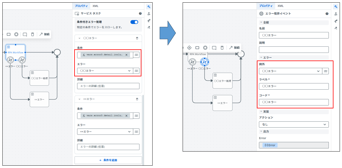 | サービスタスク | RPA / Agent / コネクタ / キュー等のアクションを選択 | 入力 / 出力 で変数をマッピング。リトライ設定可能 |