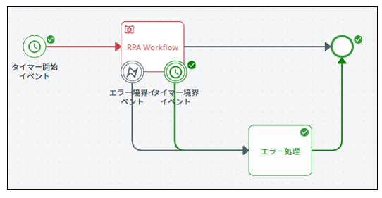 ■境界イベントの設定例(RPA実行中にエラー発生、または一定時間経過後にエラー処理に移行する例)