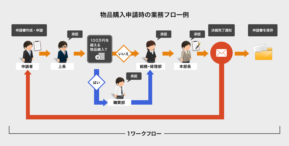 たとえば、物品の購入申請の際に行われる業務フローについて考えてみましょう。